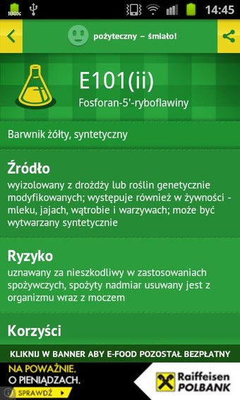 Aplikacja e-food to mobilny przewodnik po składnikach produktów, które zwykle kupujesz. Jeżeli interesuje Cię, co zawiera Twój ulubiony batonik lub napój, to e-food może Ci pomóc w odkryciu tej tajemnicy.